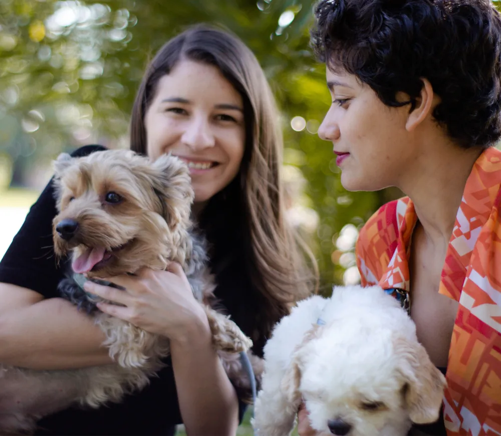 Here, the two people are leaning toward each other, connected by the dogs in their arms. The dogs are the link between them—a shared responsibility, a shared joy, and a shared love.